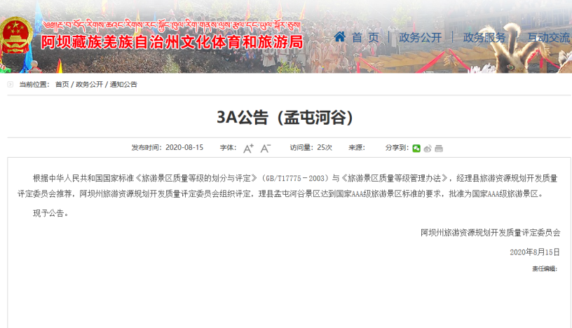 2020年8月,孟屯河谷景區(qū)多措并舉成功創(chuàng)建為國家AAA級旅游景區(qū),為理縣全域旅游建設新增了一張?zhí)厣?/span>
