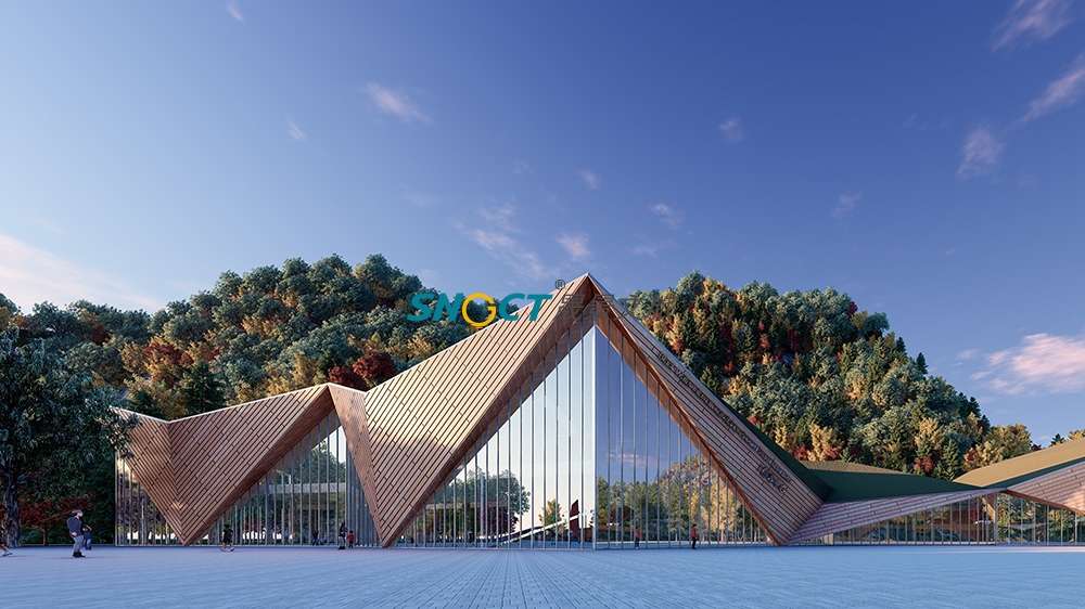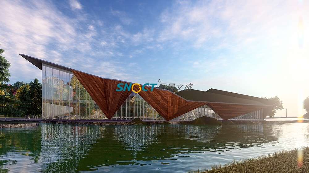 本項目建筑面積約2500平方米。方案設(shè)計上提取奶子溝“彩林、冰山、河川、生態(tài)”的印象標簽,以“融合”為核心,將其貫穿起來,形成了“水為形,山為勢,山川一體”的設(shè)計概念,對標國際冰川彩林旅游度假目的地的設(shè)計要求。